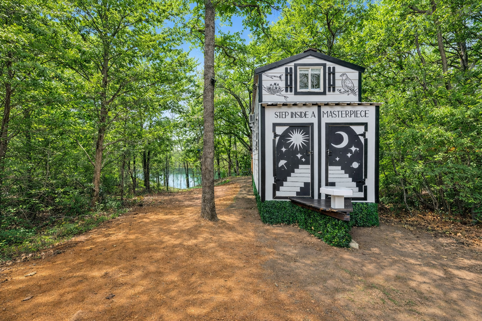 The Doodle House is a one-of-a-kind, lakefront tiny home just outside Austin—fully hand-drawn and designed to feel like stepping inside a living sketch. Sitting on the edge of a peaceful lagoon, this whimsical glamping stay blends art, comfort, and creativity. Enjoy a cozy sleeping loft, a reading nook, curated doodle-filled interiors, and a fully equipped kitchen. Outside, relax by the water, grill, fish, kayak, or gather around the fire pit under fairy lights. 1 kayak included.